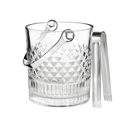 Balde de gelo em cristal ecológico com alça e pinça em aço inox. Ideal para manter suas bebidas sempre geladas com elegância e estilo. Capacidade de 1 litro, perfeito para eventos e recepções.