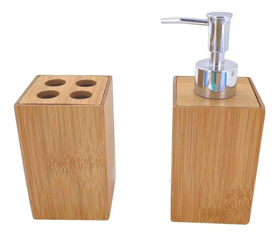 KIT BANHEIRO E LAVABO EM BAMBU COM DISPENSER PARA SABONETE LÍQUIDO E PORTA ESCOVAS Descrição do Produto Kit composto por: - 1 dispenser para sabonete líquido - 1 porta-escovas de dente Este lindo kit é feito em bambu, material resistente, sustentável e ecológico, que traz uma decoração rústica ao seu banheiro. Opção prática e higiênica, pois o dispenser possui um pump que facilita o uso do produto na hora de lavar as mãos e o porta-escovas tem os furos para encaixe das escovas. Características: MATERIAL -Principal: Bambu COR -Principal: Natural MEDIDAS >>DISPENSER DE SABONETE LÍQUIDO - Altura: 17 cm - Largura: 7 cm - Profundidade: 7 cm - Capacidade: 300 ml >>PORTA-ESCOVAS - Altura: 11 cm - Largura: 7 cm - Profundidade: 7 cm