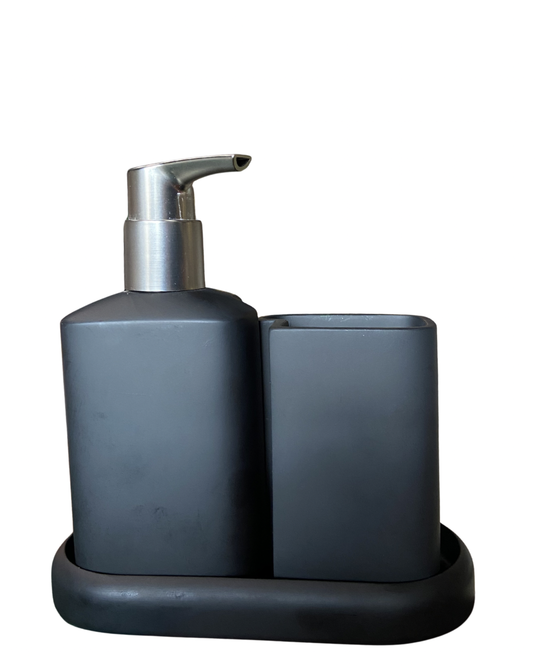 O kit é composto por porta sabonete líquido, porta cotonete e bandeja, peças essenciais para manter os itens de uso diário organizados com estilo.