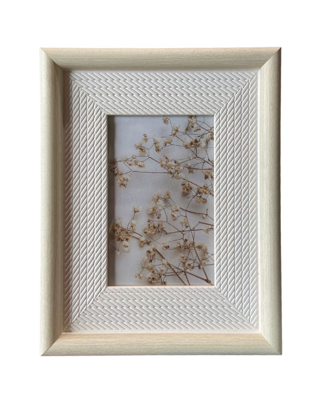 Este porta-retrato 10x15 cm combina moldura em tom amadeirado claro com parte interna em acabamento texturizado geométrico, criando um contraste elegante e delicado. O relevo em padrão trançado adiciona profundidade e um toque moderno, sem perder a leveza da tonalidade neutra.